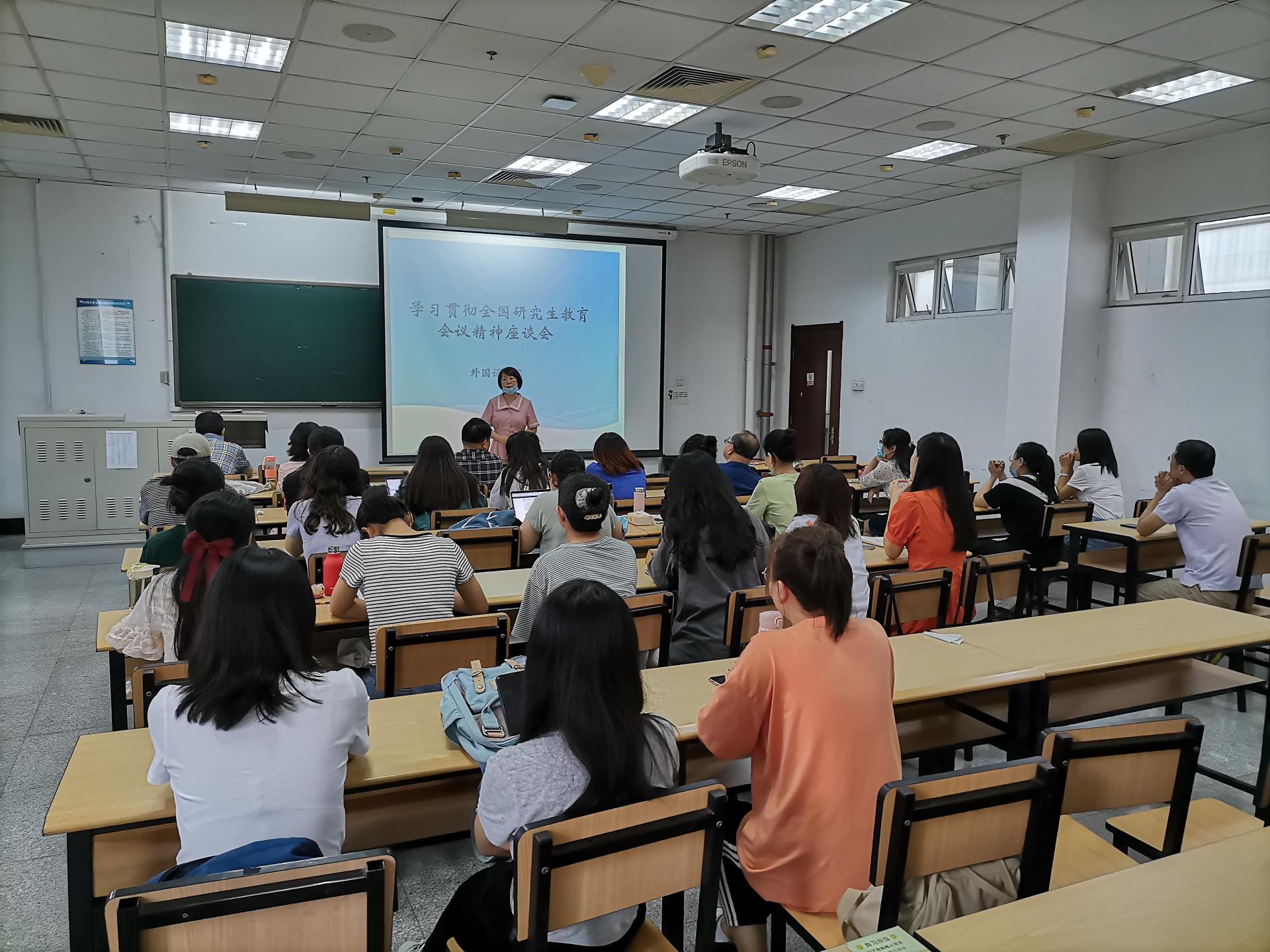 王占斌院长在学习动员讲话中指出研究生的培养数量和质量存在“增量未增质”失调现象,内涵式培养不足,与国家对高端人才的需求存在差距,因此研究生教育急需改革。他号召全体师生以学习全国研究生教育会议精神为契机,积极思考和探讨开云足球(中国)研究生教育中存在的突出问题以及可行的解决方案,为学院研究生教育发展献计献策。张允副院长带领与会师生一起学习了全国研究生教育会议精神,并传达了陈冠益副校长在学校学习座谈会上的重要指示。会上,各位硕士生导师分别结合会议精神发表了自己对研究生教育的看法,并提出了针对性建议。导师们普遍认为,外语学科的研究生培养应立足于学科现实,强化语言基本功,突出应用特色,紧跟市场需求,有针对性地提升自身的专业素养;研究生的培养要德才兼备,保持探索精神和持续学习的状态,关注科技动态,结合国家的需要,研究具体现实问题。来自18级和19级的四名研究生代表也积极发言,纷纷表示要把握好当下的大好时光,脚踏实地,刻苦专研,努力成为党和国家需要的研究型创新型人才。